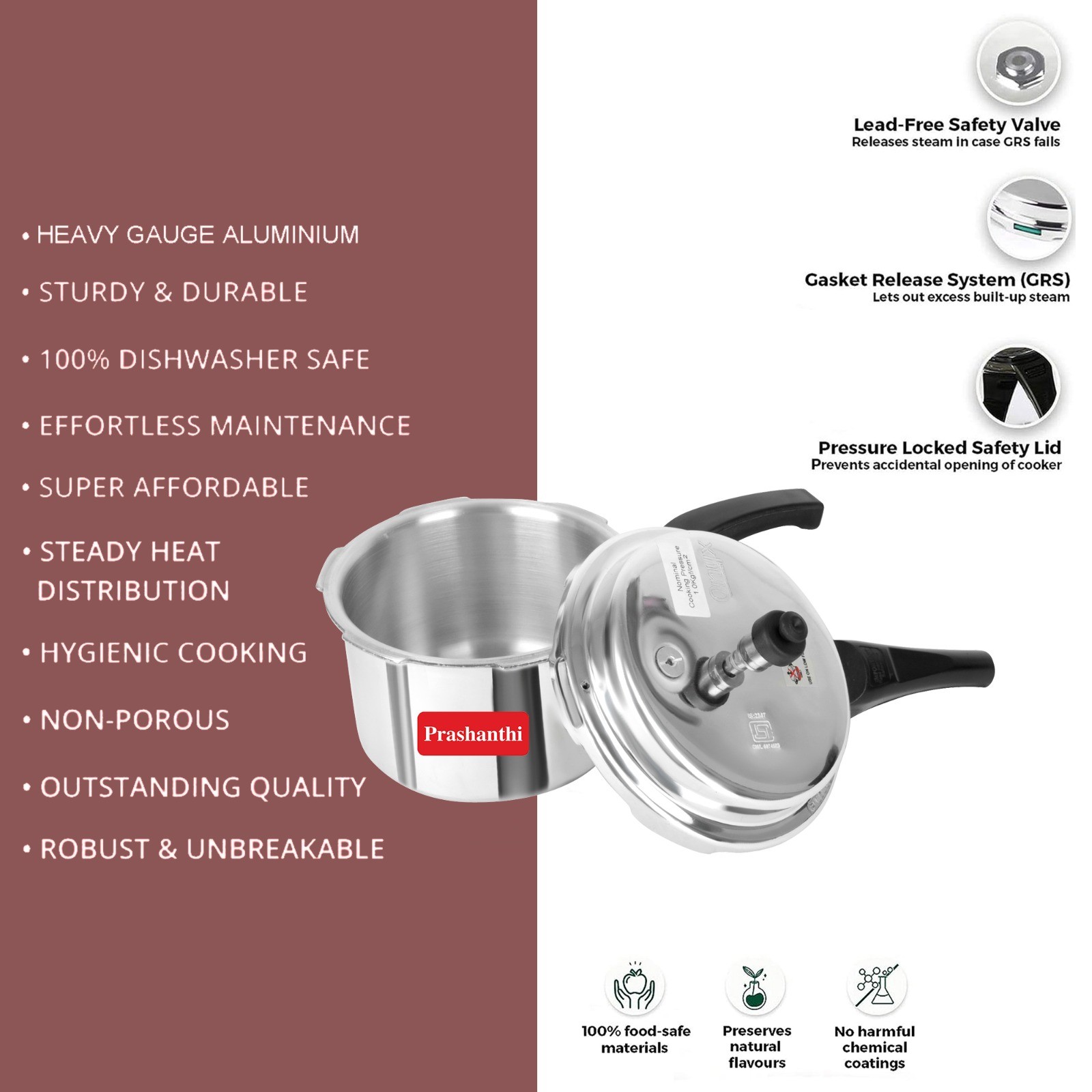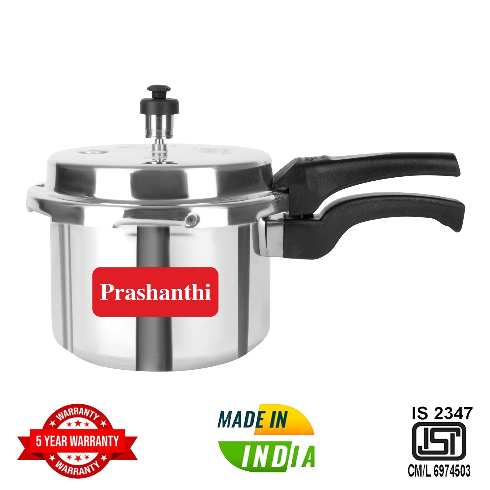 Proudly manufactured in India, the Prashanthi Ganga Pressure Cooker supports local craftsmanship and is built to meet Indian cooking needs. It reflects the rich tradition of Indian cooking while incorporating modern technology.